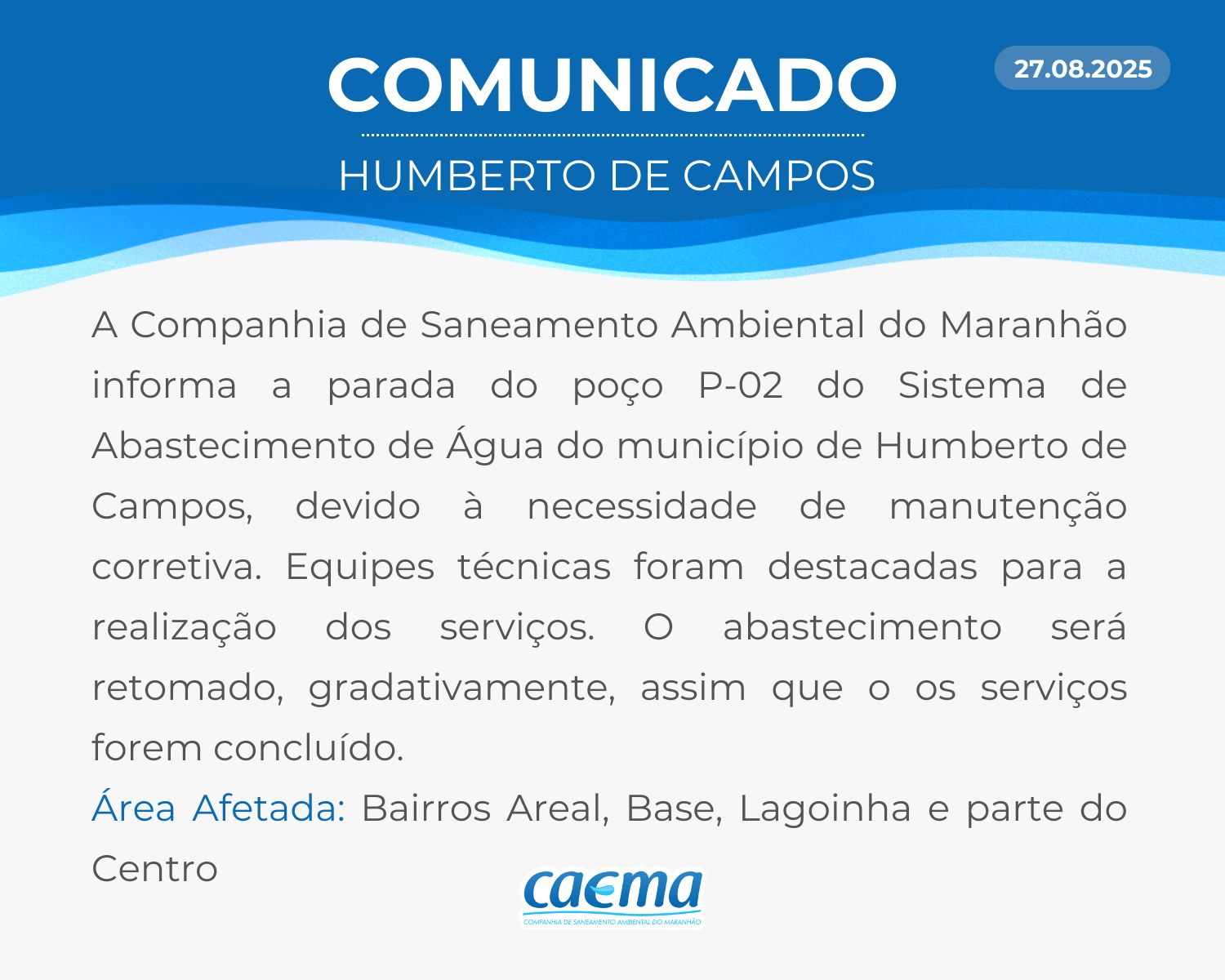 AVISO DE PRIVACIDADE: A CAEMA utiliza as informações sobre sua navegação para melhorar a sua experiência no site e oferecer soluções mais adequadas para você. Não utilizamos seus dados de cookies para estatísticas ou marketing. Ao continuar navegando, você concorda com a nossa Política de Privacidade.