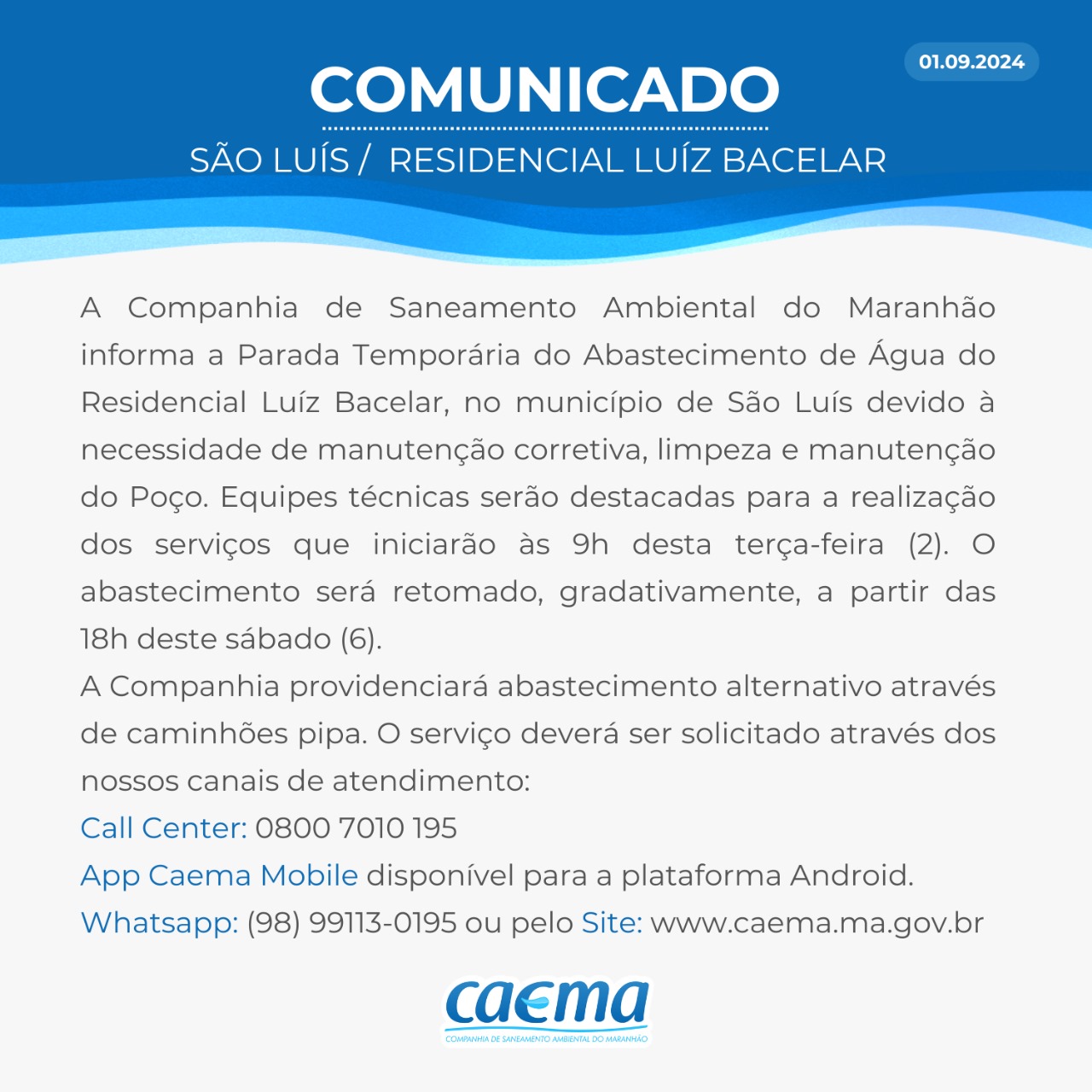 AVISO DE PRIVACIDADE: A CAEMA utiliza as informações sobre sua navegação para melhorar a sua experiência no site e oferecer soluções mais adequadas para você. Não utilizamos seus dados de cookies para estatísticas ou marketing. Ao continuar navegando, você concorda com a nossa Política de Privacidade.