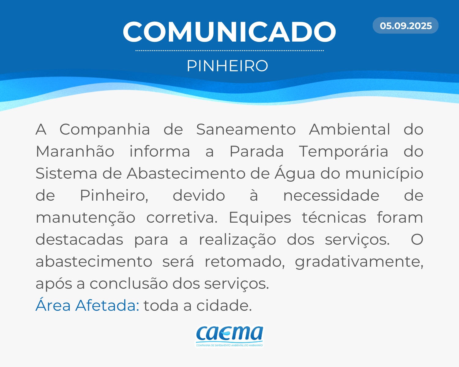 AVISO DE PRIVACIDADE: A CAEMA utiliza as informações sobre sua navegação para melhorar a sua experiência no site e oferecer soluções mais adequadas para você. Não utilizamos seus dados de cookies para estatísticas ou marketing. Ao continuar navegando, você concorda com a nossa Política de Privacidade.