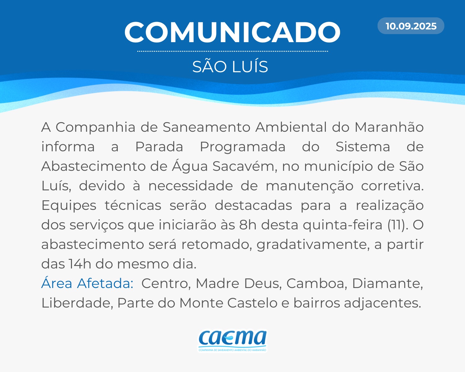 AVISO DE PRIVACIDADE: A CAEMA utiliza as informações sobre sua navegação para melhorar a sua experiência no site e oferecer soluções mais adequadas para você. Não utilizamos seus dados de cookies para estatísticas ou marketing. Ao continuar navegando, você concorda com a nossa Política de Privacidade.