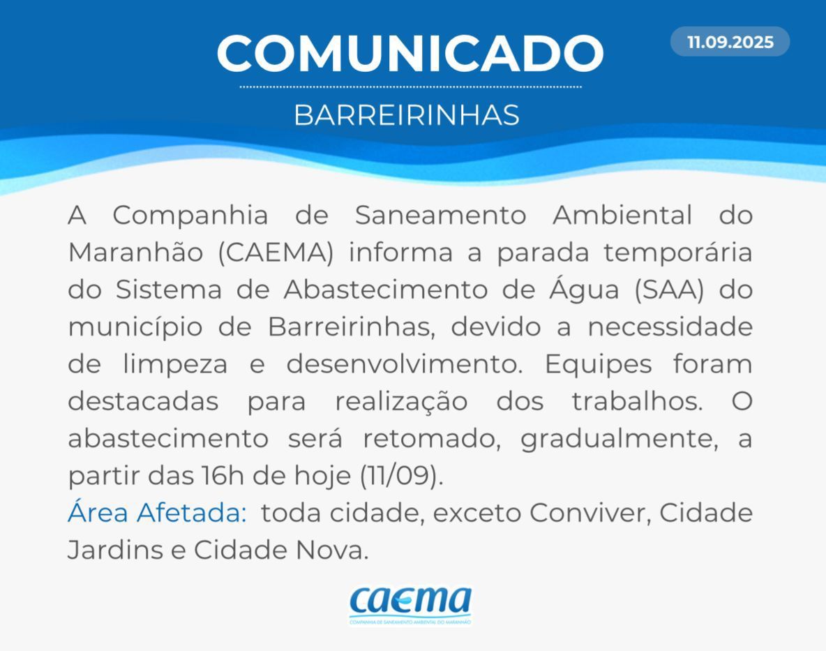 AVISO DE PRIVACIDADE: A CAEMA utiliza as informações sobre sua navegação para melhorar a sua experiência no site e oferecer soluções mais adequadas para você. Não utilizamos seus dados de cookies para estatísticas ou marketing. Ao continuar navegando, você concorda com a nossa Política de Privacidade.