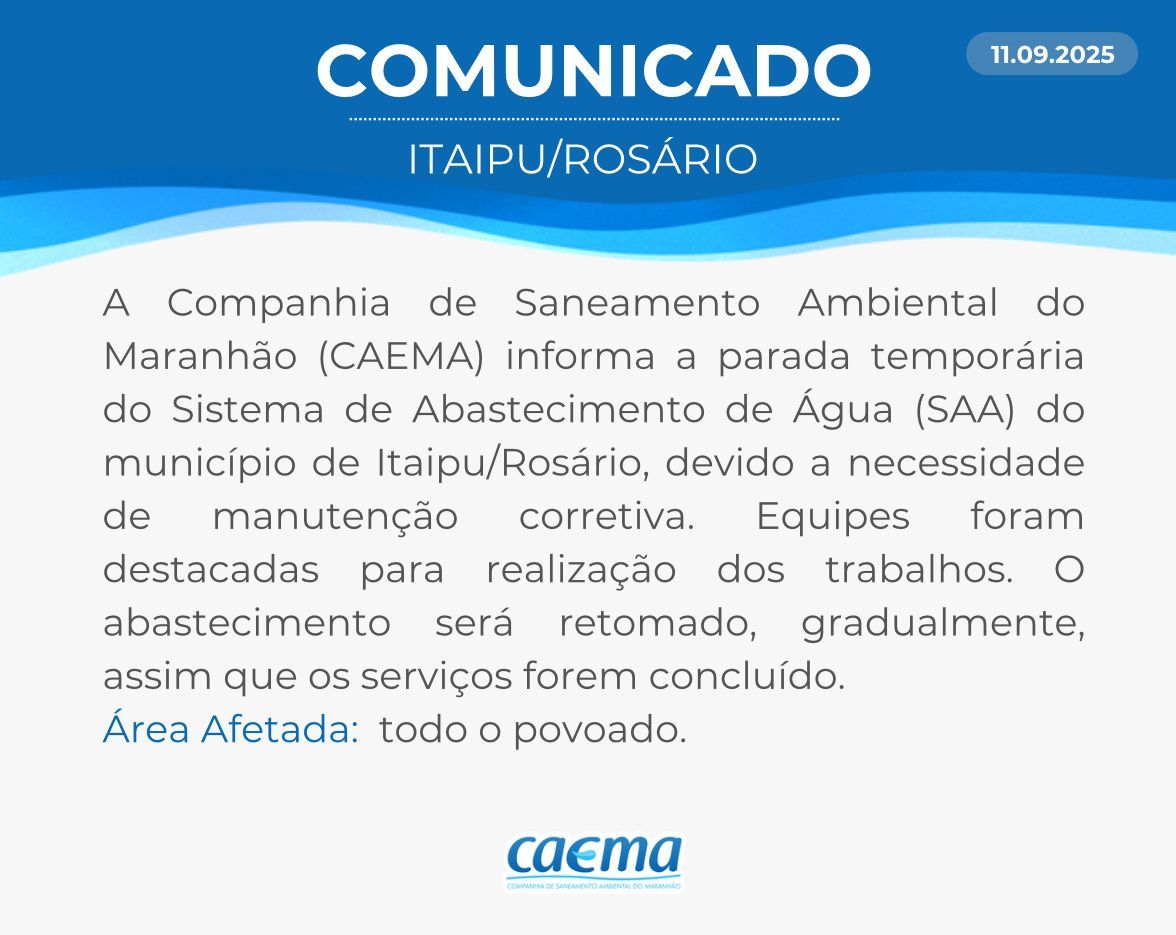 AVISO DE PRIVACIDADE: A CAEMA utiliza as informações sobre sua navegação para melhorar a sua experiência no site e oferecer soluções mais adequadas para você. Não utilizamos seus dados de cookies para estatísticas ou marketing. Ao continuar navegando, você concorda com a nossa Política de Privacidade.