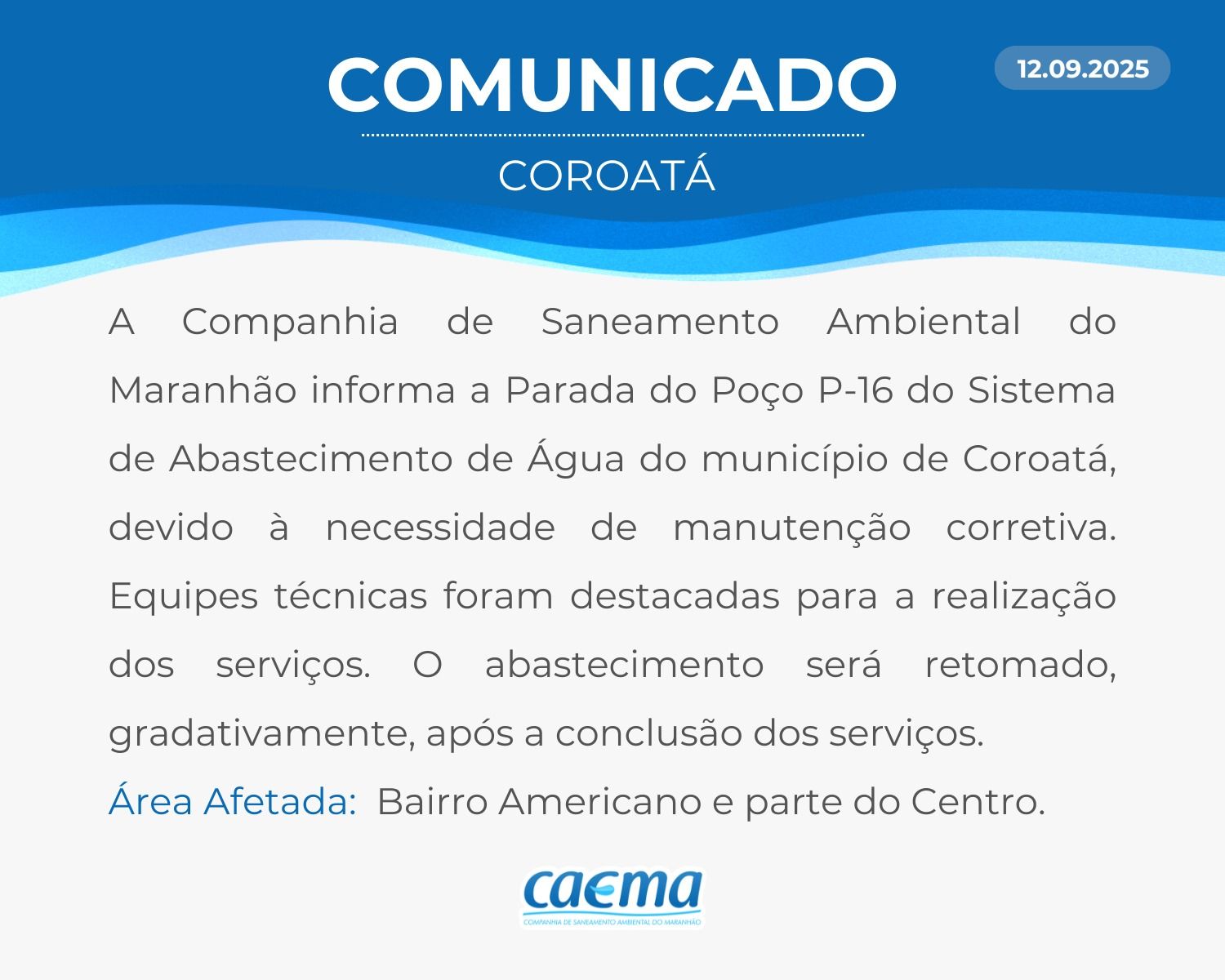 AVISO DE PRIVACIDADE: A CAEMA utiliza as informações sobre sua navegação para melhorar a sua experiência no site e oferecer soluções mais adequadas para você. Não utilizamos seus dados de cookies para estatísticas ou marketing. Ao continuar navegando, você concorda com a nossa Política de Privacidade.