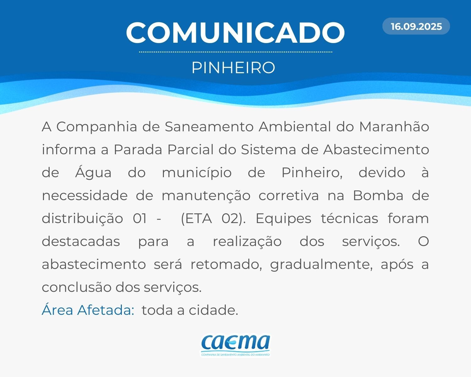 AVISO DE PRIVACIDADE: A CAEMA utiliza as informações sobre sua navegação para melhorar a sua experiência no site e oferecer soluções mais adequadas para você. Não utilizamos seus dados de cookies para estatísticas ou marketing. Ao continuar navegando, você concorda com a nossa Política de Privacidade.