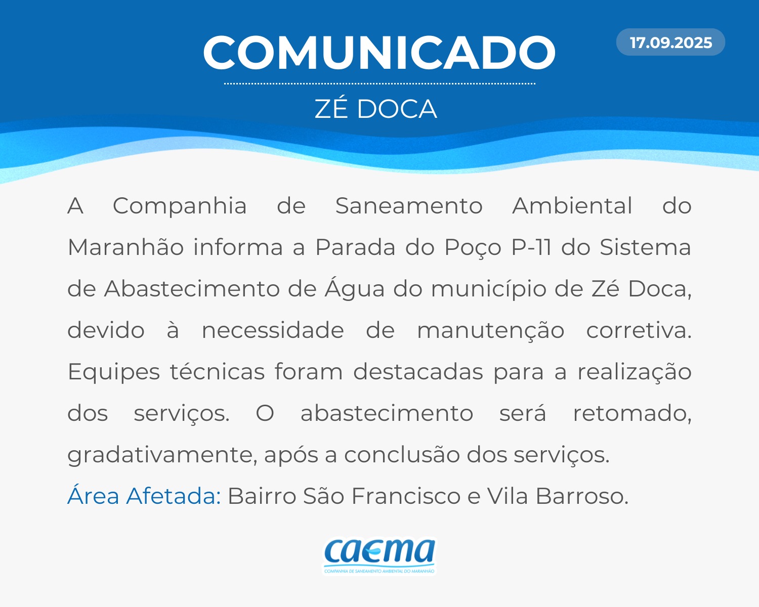 AVISO DE PRIVACIDADE: A CAEMA utiliza as informações sobre sua navegação para melhorar a sua experiência no site e oferecer soluções mais adequadas para você. Não utilizamos seus dados de cookies para estatísticas ou marketing. Ao continuar navegando, você concorda com a nossa Política de Privacidade.