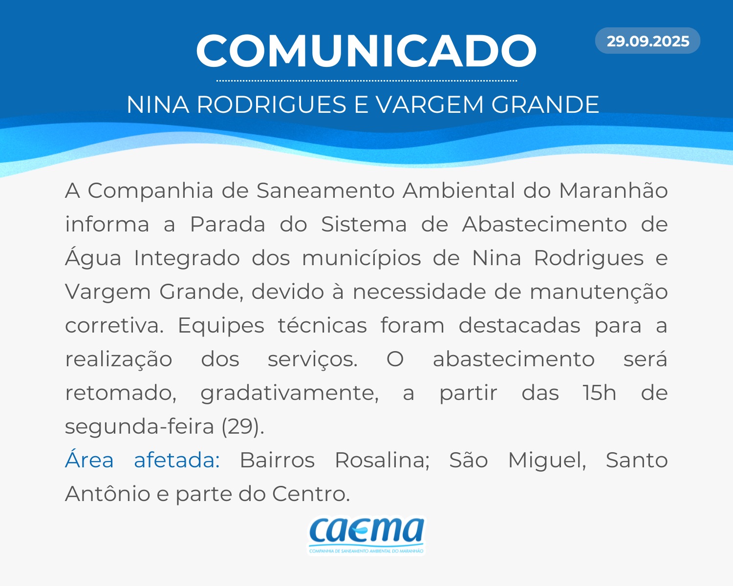 AVISO DE PRIVACIDADE: A CAEMA utiliza as informações sobre sua navegação para melhorar a sua experiência no site e oferecer soluções mais adequadas para você. Não utilizamos seus dados de cookies para estatísticas ou marketing. Ao continuar navegando, você concorda com a nossa Política de Privacidade.