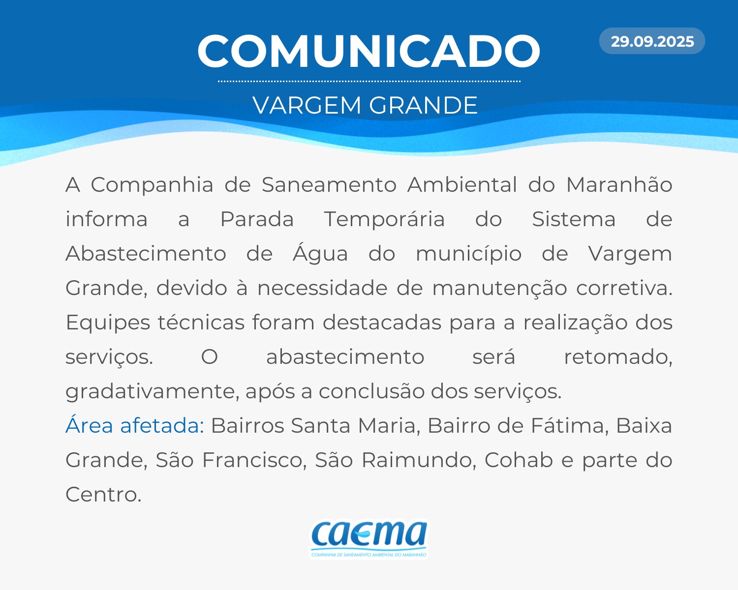 AVISO DE PRIVACIDADE: A CAEMA utiliza as informações sobre sua navegação para melhorar a sua experiência no site e oferecer soluções mais adequadas para você. Não utilizamos seus dados de cookies para estatísticas ou marketing. Ao continuar navegando, você concorda com a nossa Política de Privacidade.