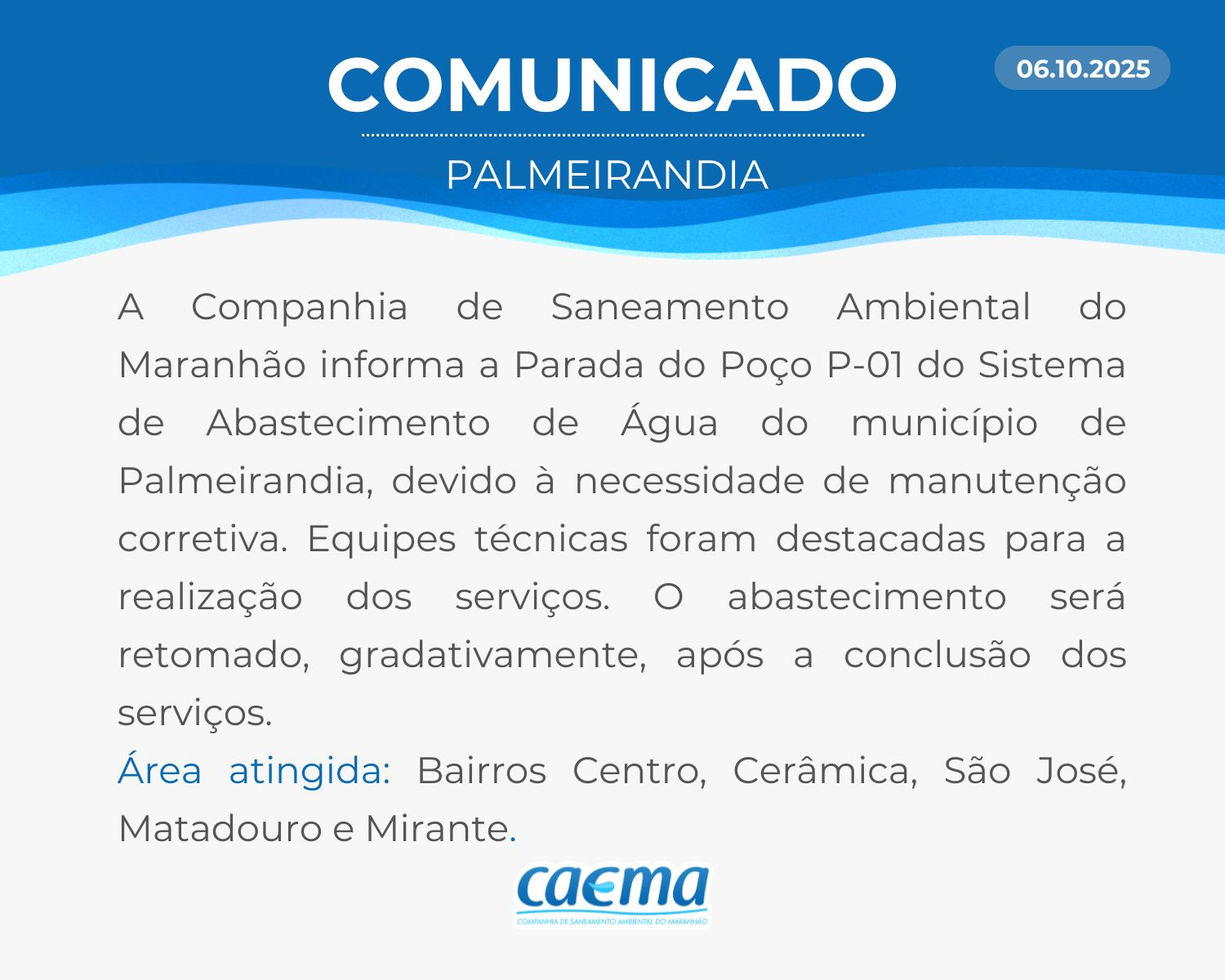 AVISO DE PRIVACIDADE: A CAEMA utiliza as informações sobre sua navegação para melhorar a sua experiência no site e oferecer soluções mais adequadas para você. Não utilizamos seus dados de cookies para estatísticas ou marketing. Ao continuar navegando, você concorda com a nossa Política de Privacidade.
