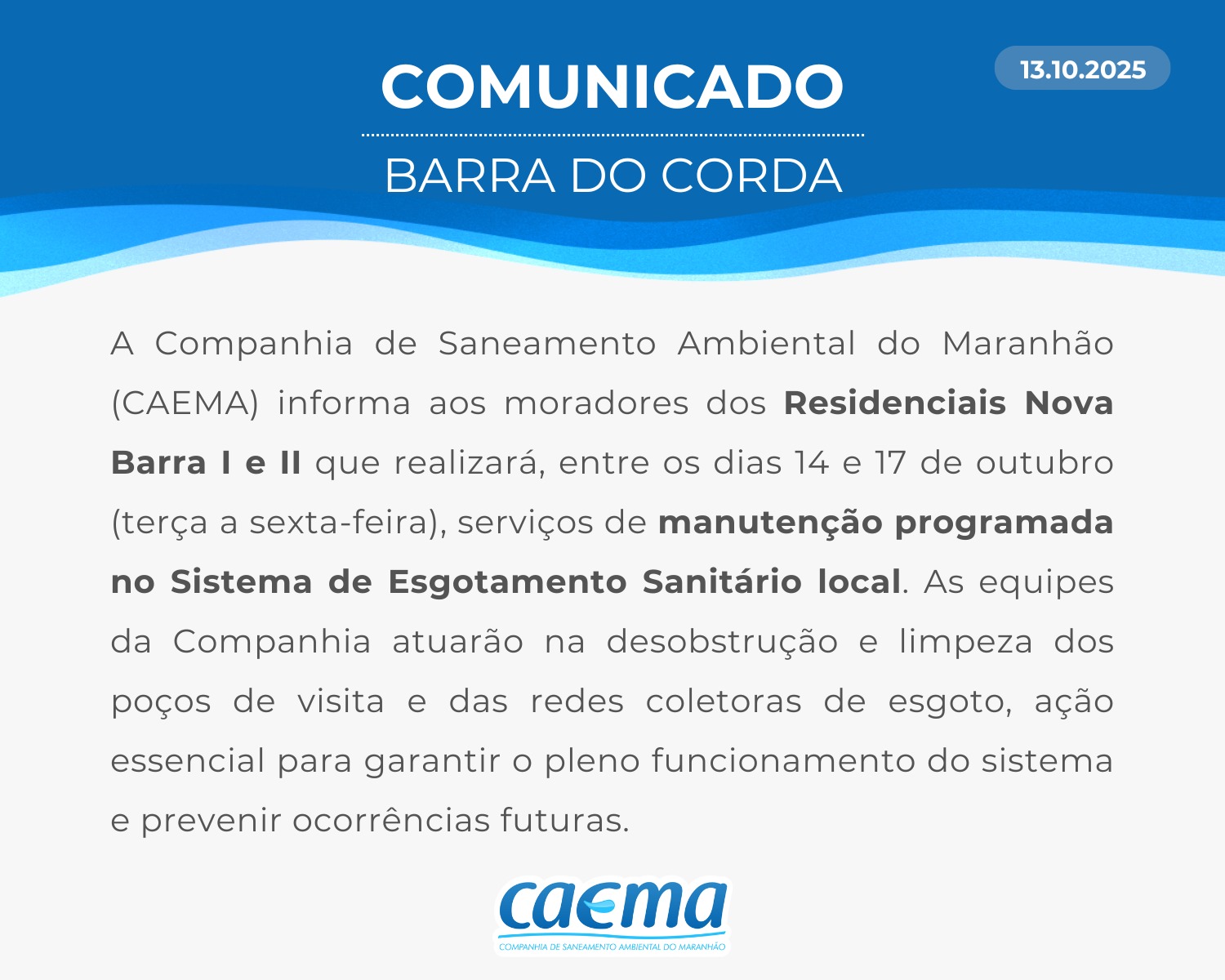 AVISO DE PRIVACIDADE: A CAEMA utiliza as informações sobre sua navegação para melhorar a sua experiência no site e oferecer soluções mais adequadas para você. Não utilizamos seus dados de cookies para estatísticas ou marketing. Ao continuar navegando, você concorda com a nossa Política de Privacidade.