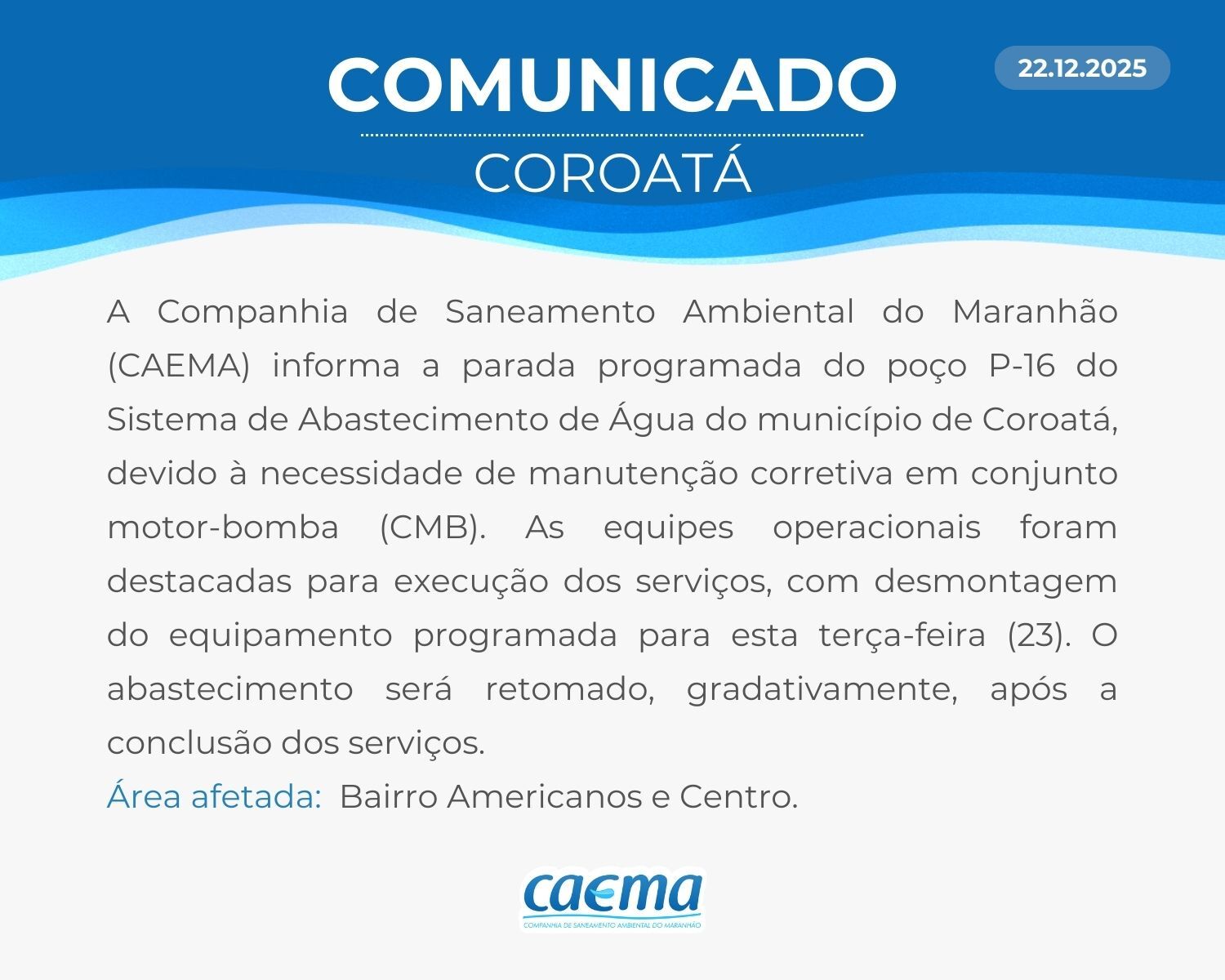 AVISO DE PRIVACIDADE: A CAEMA utiliza as informações sobre sua navegação para melhorar a sua experiência no site e oferecer soluções mais adequadas para você. Não utilizamos seus dados de cookies para estatísticas ou marketing. Ao continuar navegando, você concorda com a nossa Política de Privacidade.