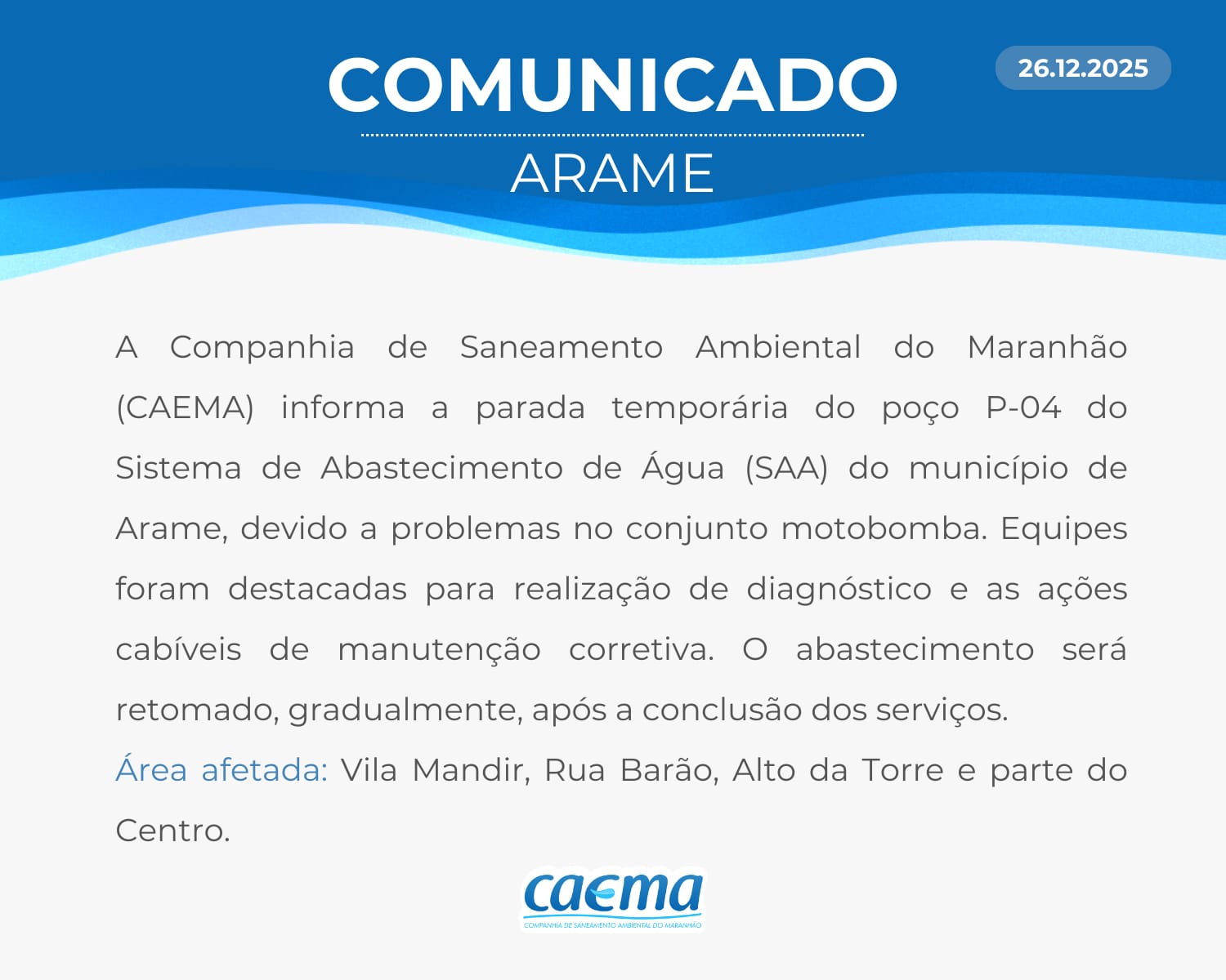 AVISO DE PRIVACIDADE: A CAEMA utiliza as informações sobre sua navegação para melhorar a sua experiência no site e oferecer soluções mais adequadas para você. Não utilizamos seus dados de cookies para estatísticas ou marketing. Ao continuar navegando, você concorda com a nossa Política de Privacidade.