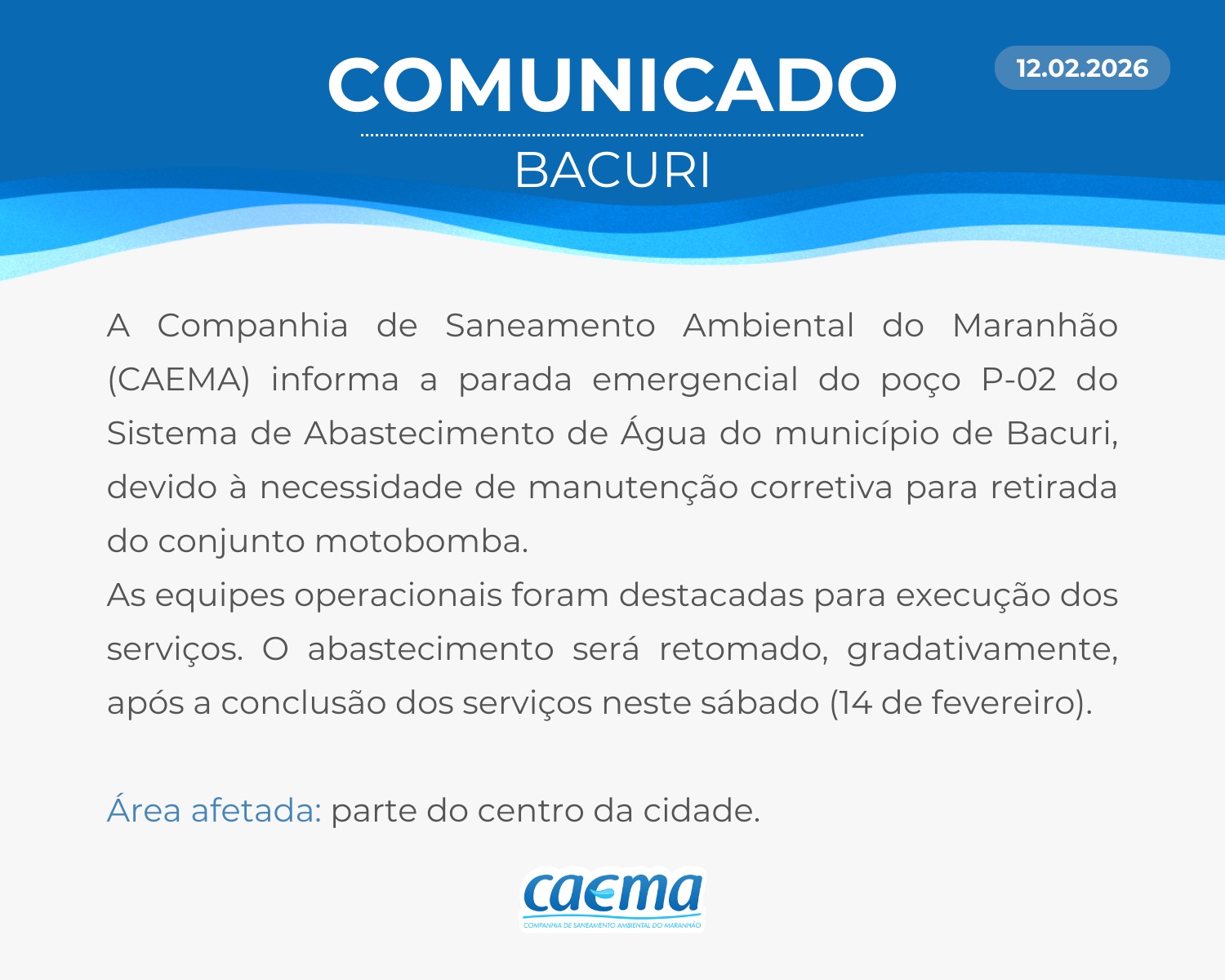 AVISO DE PRIVACIDADE: A CAEMA utiliza as informações sobre sua navegação para melhorar a sua experiência no site e oferecer soluções mais adequadas para você. Não utilizamos seus dados de cookies para estatísticas ou marketing. Ao continuar navegando, você concorda com a nossa Política de Privacidade.