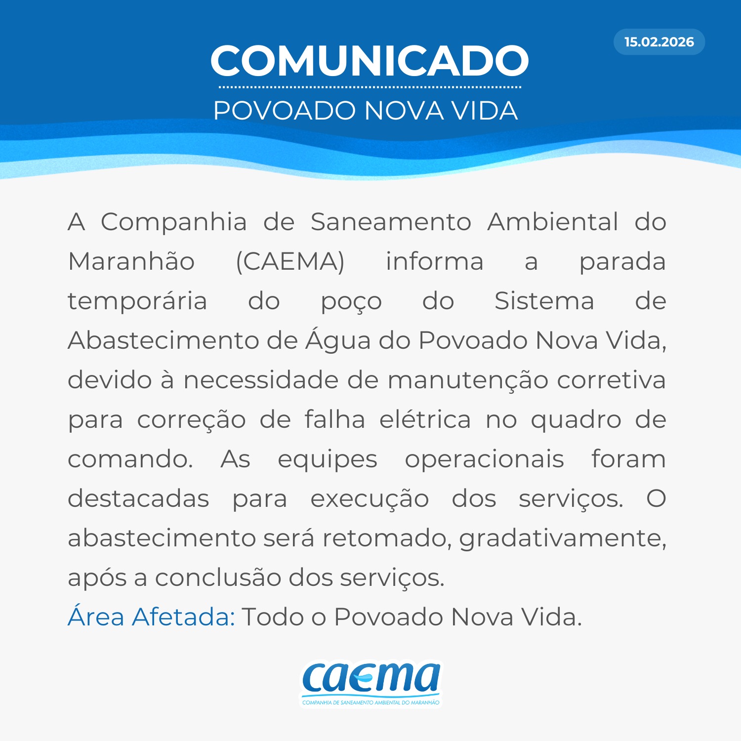AVISO DE PRIVACIDADE: A CAEMA utiliza as informações sobre sua navegação para melhorar a sua experiência no site e oferecer soluções mais adequadas para você. Não utilizamos seus dados de cookies para estatísticas ou marketing. Ao continuar navegando, você concorda com a nossa Política de Privacidade.