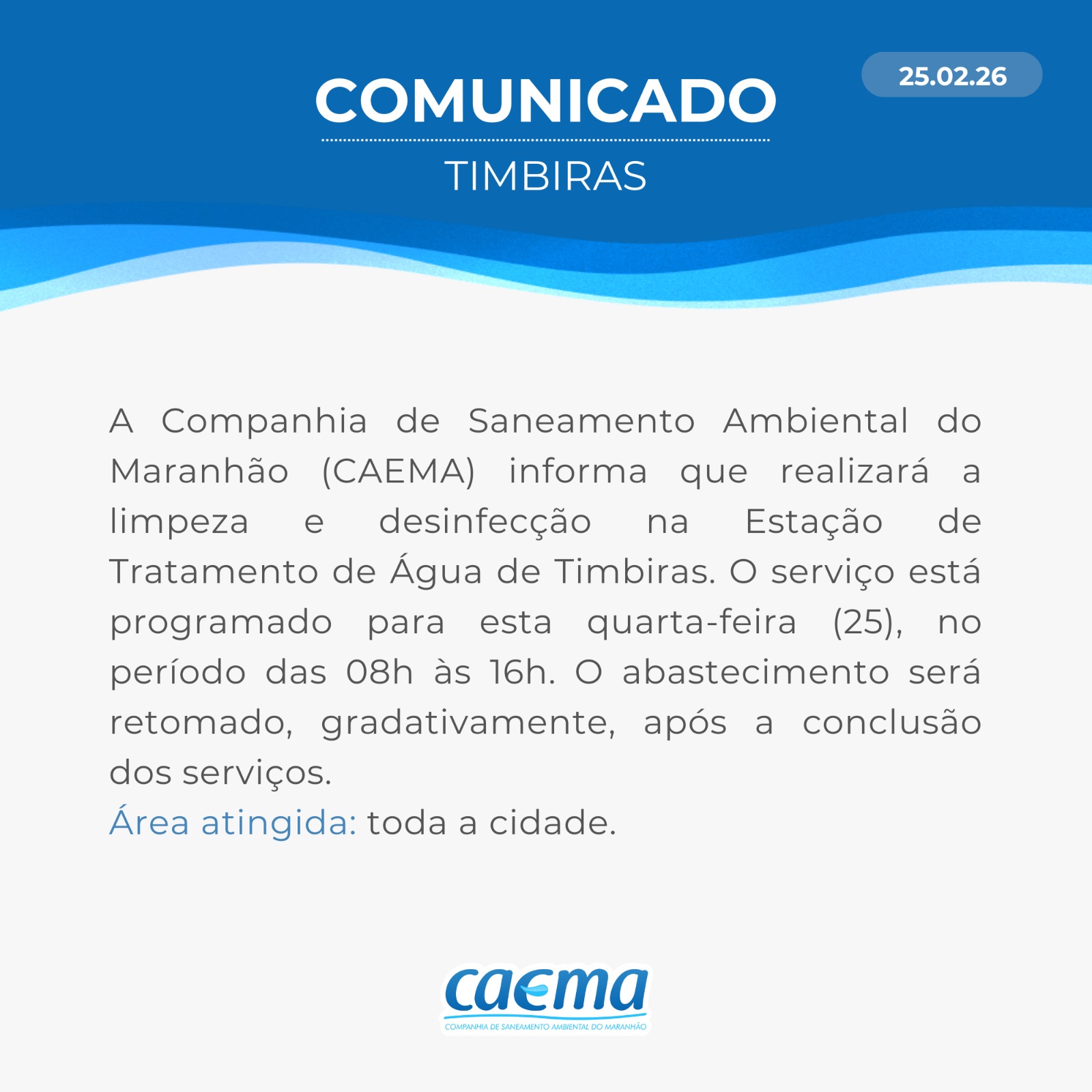 AVISO DE PRIVACIDADE: A CAEMA utiliza as informações sobre sua navegação para melhorar a sua experiência no site e oferecer soluções mais adequadas para você. Não utilizamos seus dados de cookies para estatísticas ou marketing. Ao continuar navegando, você concorda com a nossa Política de Privacidade.