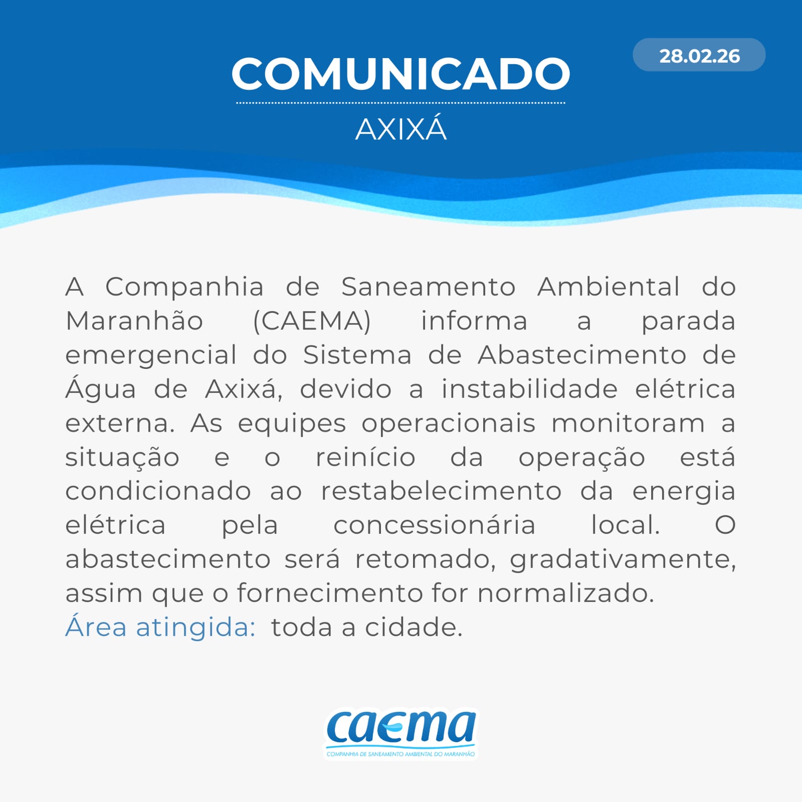 AVISO DE PRIVACIDADE: A CAEMA utiliza as informações sobre sua navegação para melhorar a sua experiência no site e oferecer soluções mais adequadas para você. Não utilizamos seus dados de cookies para estatísticas ou marketing. Ao continuar navegando, você concorda com a nossa Política de Privacidade.