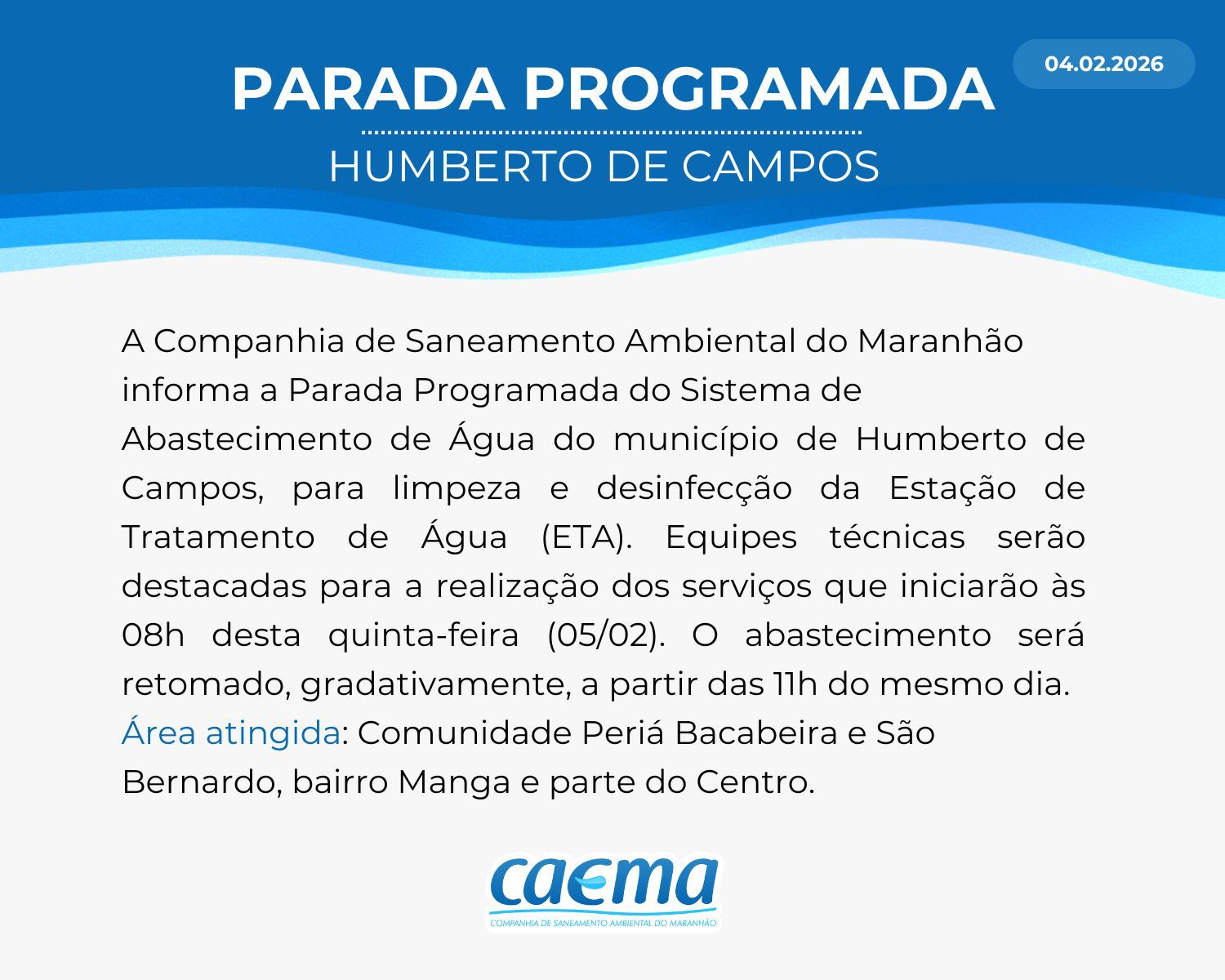 AVISO DE PRIVACIDADE: A CAEMA utiliza as informações sobre sua navegação para melhorar a sua experiência no site e oferecer soluções mais adequadas para você. Não utilizamos seus dados de cookies para estatísticas ou marketing. Ao continuar navegando, você concorda com a nossa Política de Privacidade.